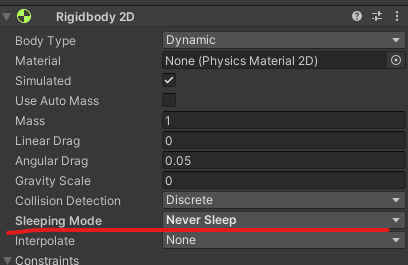 이유를 찾아보니 RigidBody2D의 SleepingMode(수면 모드)를 Never Sleep으로 바꿨더니 위 문제가 해결됐다.