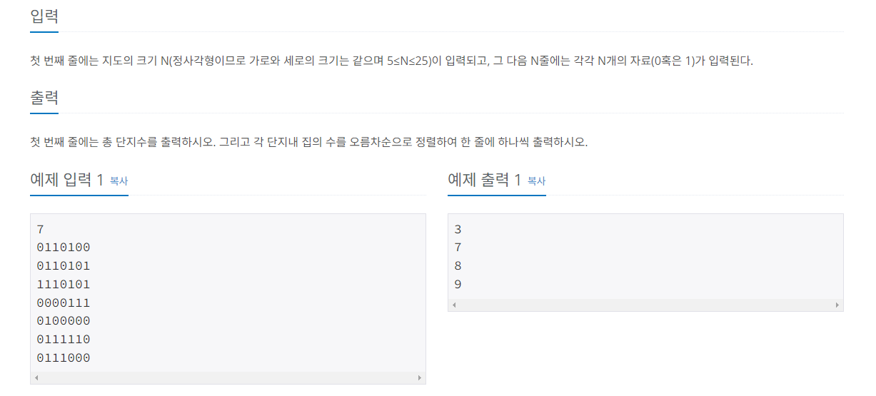 이 문제는 1로 이어진 아파트 단지 수와 각 단지내 집의 수를 오름차순으로 출력하는 문제이다.