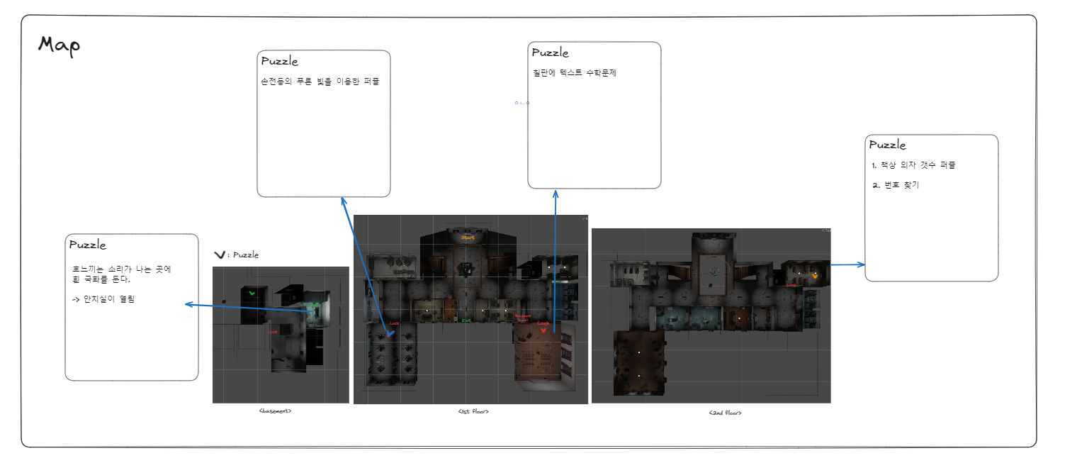 맵은 지하, 1층, 2층으로 이루어져 있고 퍼즐을 푸는 방은 잠겨 있어, 맵을 돌아다니면서 열쇠를 얻어야한다.