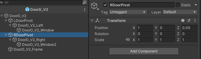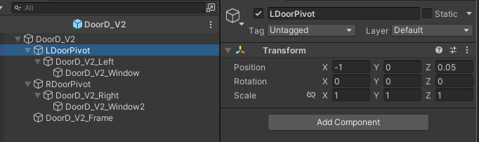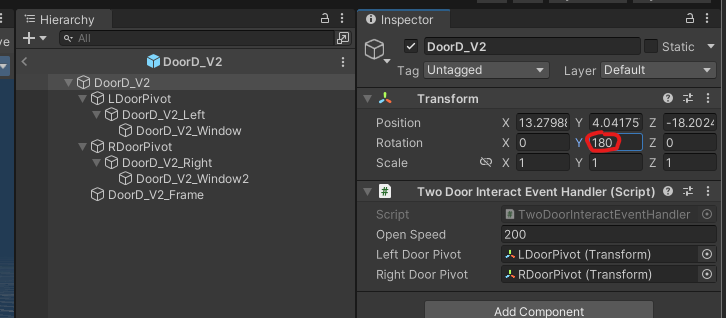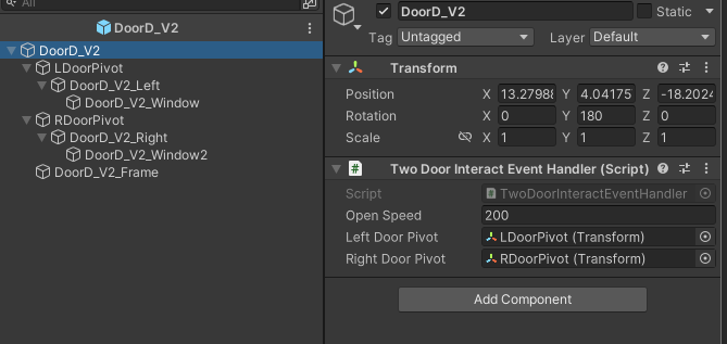 루트 오브젝트에 TwoDoorInteractEventHandler 스크립트를 추가하고 인스펙터 창에서 Pivot 오브젝트를 캐싱한다.