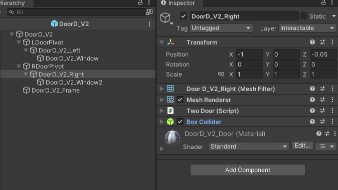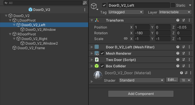 여기서 MeshCollider가 아닌 BoxCollider를 사용한 이유는 해당 문 오브젝트는 자식에 유리창 오브젝트가 존재하기 때문에 MeshCollider를 사용한다면 유리창은 인식을 못하기 때문에 BoxCollder를 사용해 문 전체를 탐색할 수 있도록 했다.