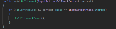 PlayerInputController에서 InputSystem을 이용하여 상호작용 키를 입력을 받고 PlayerController에 선언된 Event Action을 실행시킨다.