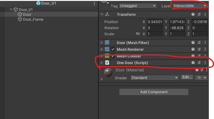 위와 같이 스크립트를 작성한 뒤, Door 오브젝트에 추가하고 레이어를 변경한다.