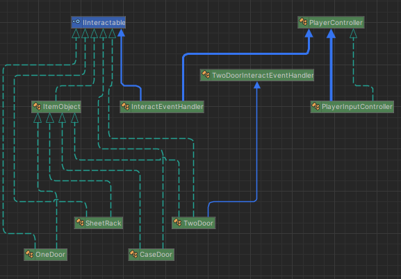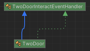 TwoDoor 클래스를 각 문에 추가하고, 상호작용 키를 눌렀을 때 TwoDoorInteractEventHandler에 있는 함수를 호출하여 문의 상호작용을 처리하는 방식으로 설계했습니다.