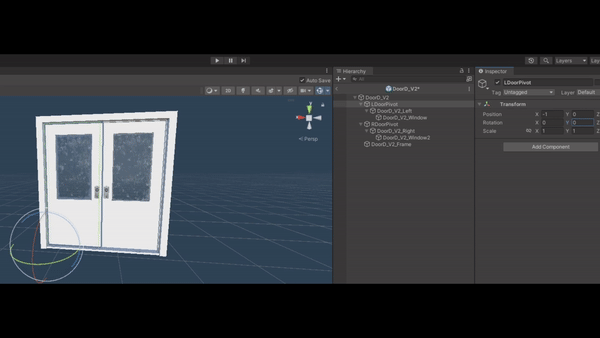 두 개의 문 프리팹의 문 Pivot이 양 끝쪽이 아닌 가운데에 위치해 있기 때문에 Pivot 오브젝트를 생성하고 각 문을 그 자식으로 넣어주었다.