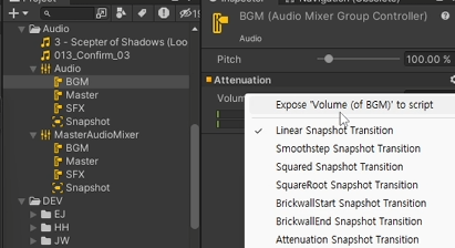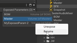 Project에서 Master, BGM, SFX 그룹을 선택한 다음 Volume을 우클릭해서 Expose "Volume (of 이름)" to script를 클릭한다.