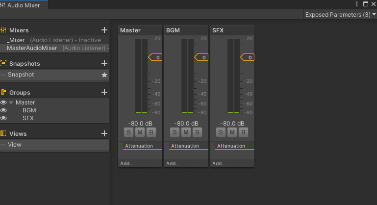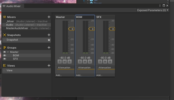 오디오 믹서를 열게 된다면 Master만 존재하는데, Groups의 +를 눌러 BGM, SFX 그룹을 생성한다.