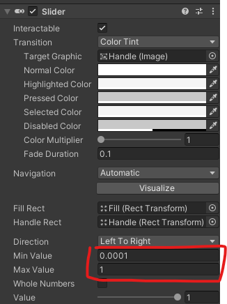 이때, 슬라이더의 Min Value를 0.0001로 설정해줘야한다.