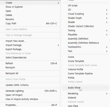 Project → 우클릭 → Create → 오디오 믹서 생성