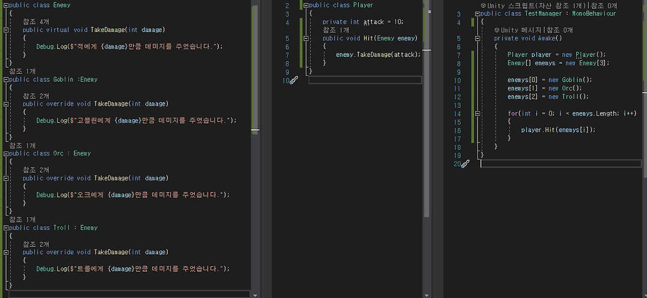 해당 포스팅은 고박사님의 유니티 C# 강의를 보고 공부한 내용과 추가적으로 공부한 내용을 정리한 포스팅입니다. 다형성 객체가 여러 가지 다양한 형태를 가지는 것을 뜻한다. → 상속을 받는