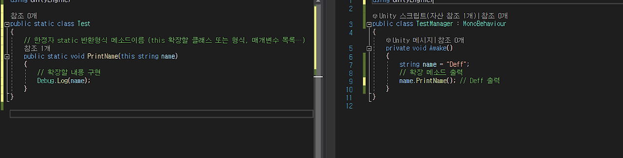 - 확장 메소드는 기존 클래스 기능을 확장하는 기법으로, 다른 클래스에 인스턴스 메소드를 추가할 수 있다.
