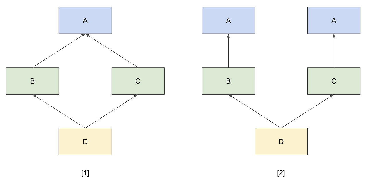 - 다이아몬드 문제는 두 개의 다른 하위 클래스가 동일한 상위 클래스를 상속받고, 이를 다시 다중 상속받는 클래스에서 발생한다. 이러한 구조로 인해 다중 상속을 받는 클래스는 동일한 상위 클래스의 인스턴스를 두 번 상속받게 되어, 메서드 호출이나 속성 참조 시 어떤 경로를 통해 상속받은 것인지 모호해진다.