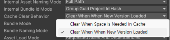 Local Group을 누른 뒤, 인스펙터 창에서 Bulid & Load Paths 와 Cache Clear Behavior를 위 사진과 같이 설정한다.