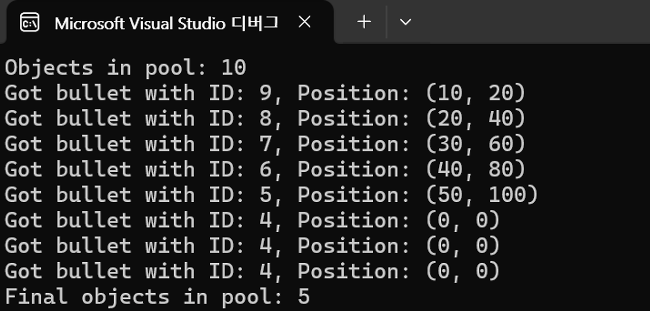 Console.WriteLine($"Final objects in pool: {bulletPool.Count()}");