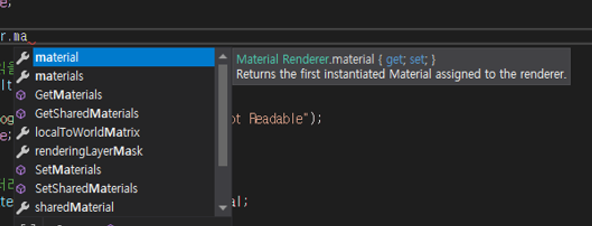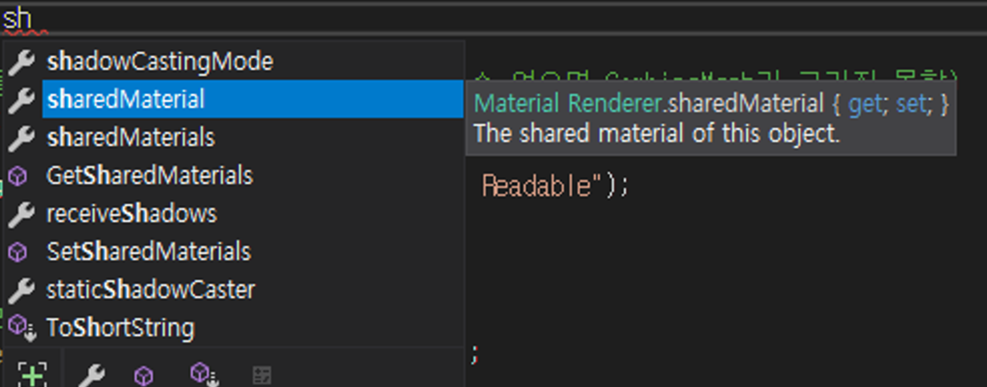그렇기 때문에 각각 다른 값을 부여해야하는 경우에는 material에 접근해야되고 같은 값을 가질 때는 sharedMaterial로 접근하면된다.