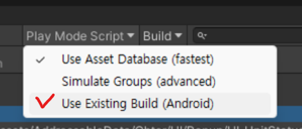 Play Mode Script를 Use Existing Build로 변경한 뒤, Build > New Build > Default Build Script를 눌러 빌드한다.