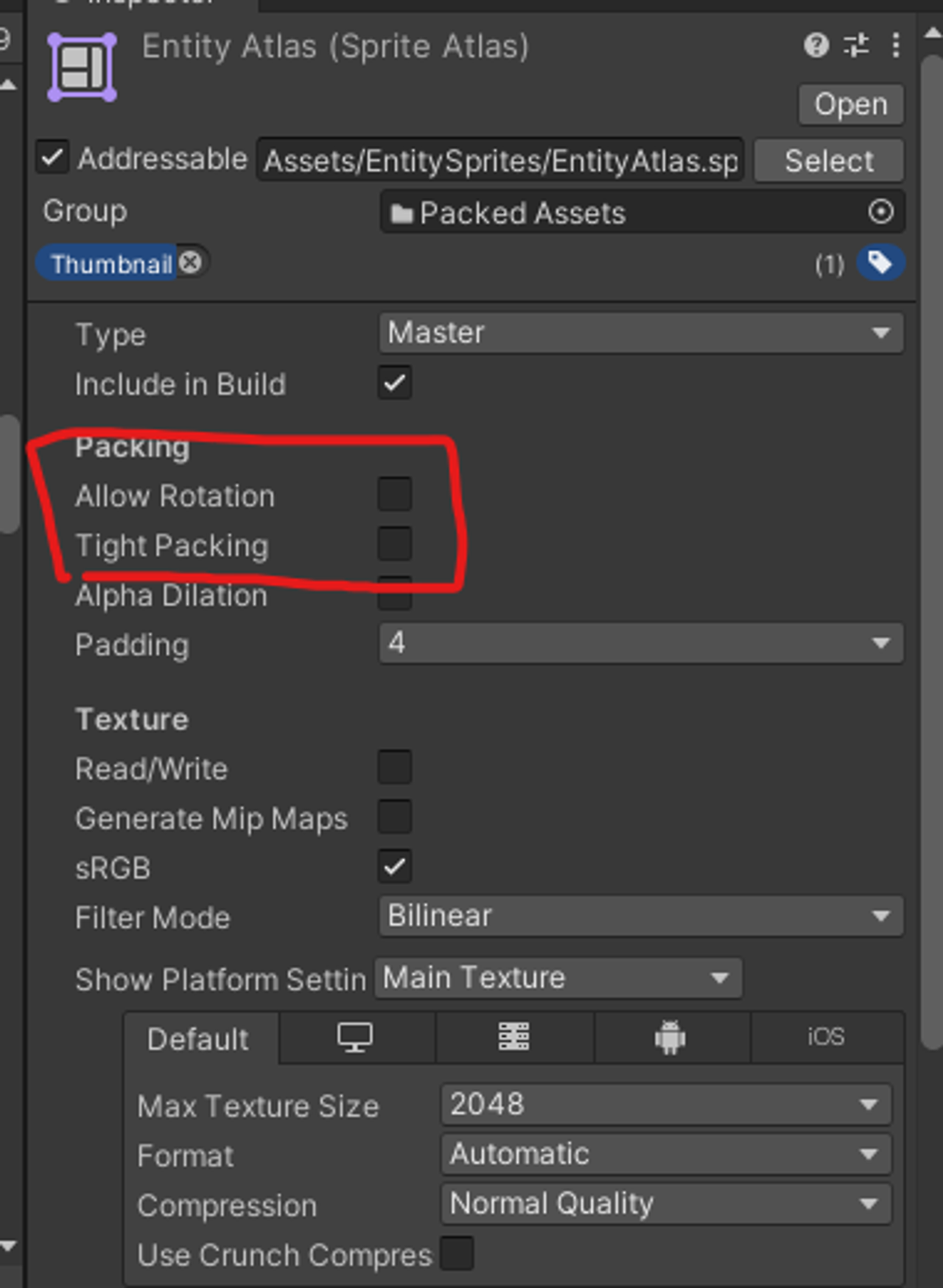 아틀라스의 Allow Rotation, Tight Packing이 기본적으로 체크되어 있을 텐데, 이 옵션들을 체크해제 하면 된다.