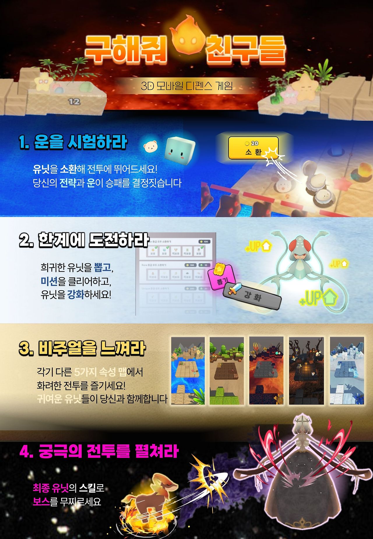 맵 테마 별로 다양한 컨셉을 가진 보스들을 물리치면서 마지막 보스인 어둠보스를 처치하는 게임이다.