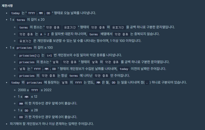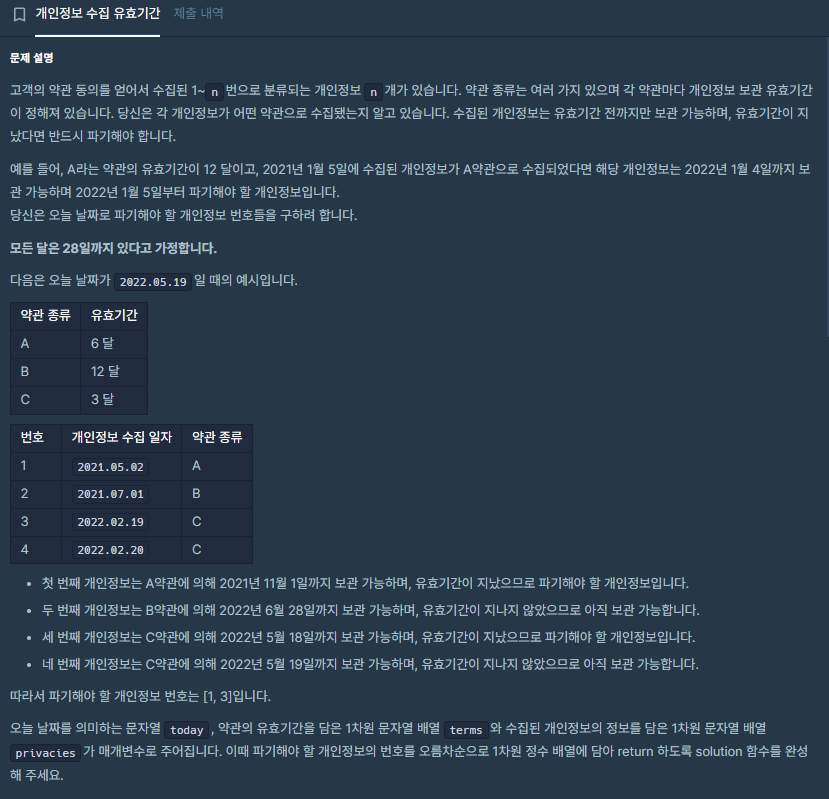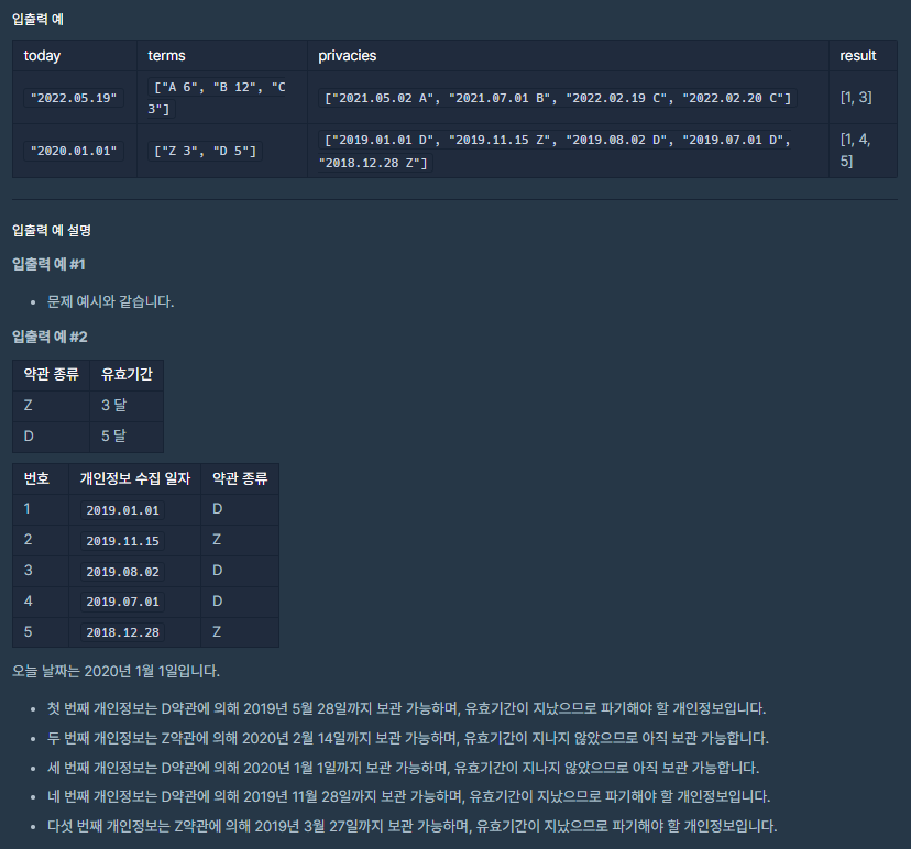 주어진 문제는 현재 날짜와 약관 별 유효기간(달), 개인정보 수집 일자가 입력되고,
