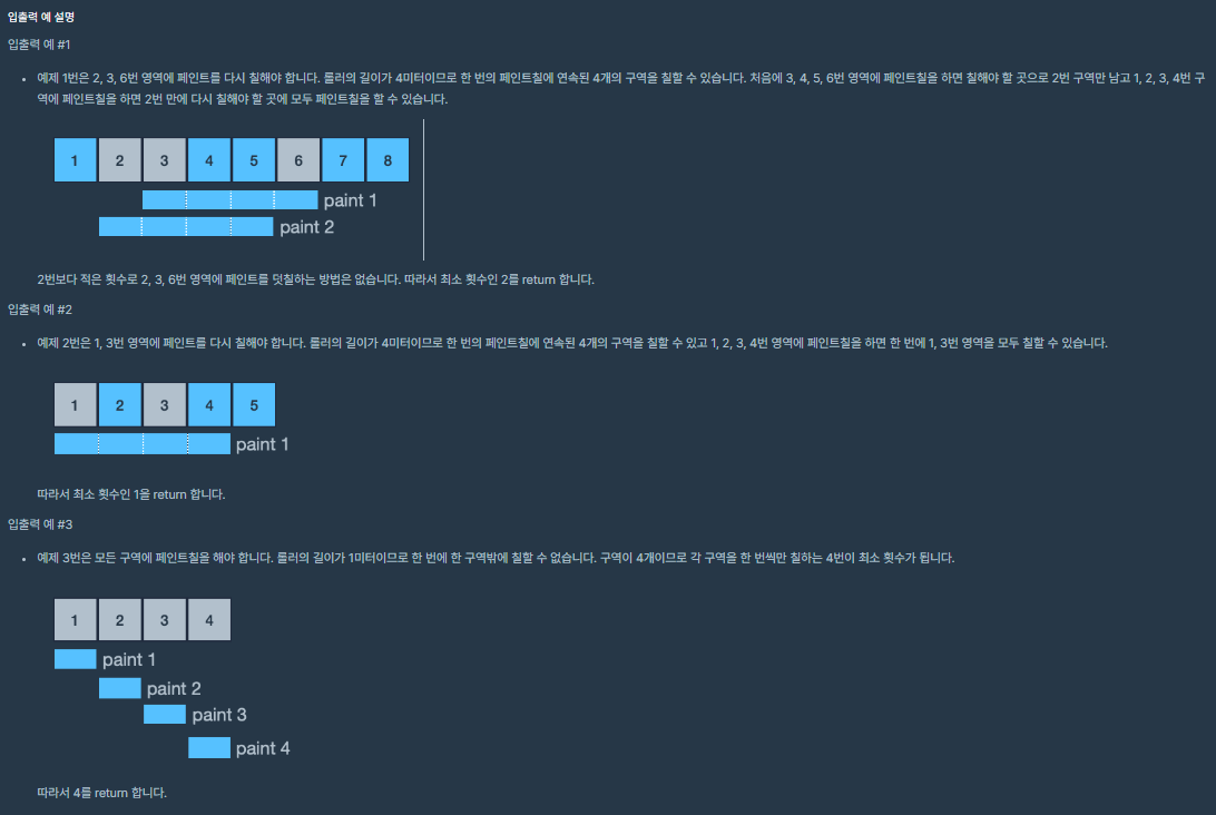첫 구역부터 순서대로 덧칠하고, 덧칠이 안 된 구역부터 다시 덧칠하는 방법으로 문제를 풀이했다.