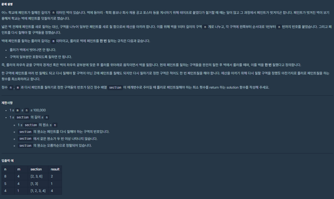 이 문제는 m미터의 길이를 가진 롤러로 덧칠해야할 모든 구역을 덧칠할 때 최소 덧칠 횟수를 구하는 문제입니다.