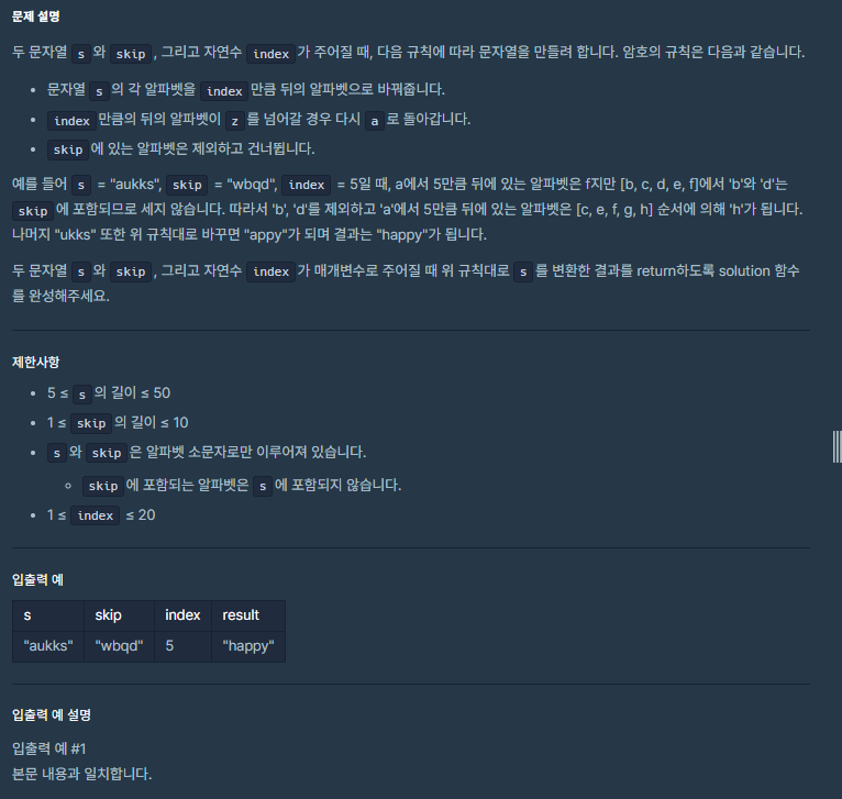 해당 문제는 문자열 s에 있는 각 알파벳을 주어진 index만큼 뒤로 이동시키되, skip 문자열에 있는 알파벳은 건너뛰고 변환한 결과를 반환하는 문제이다.