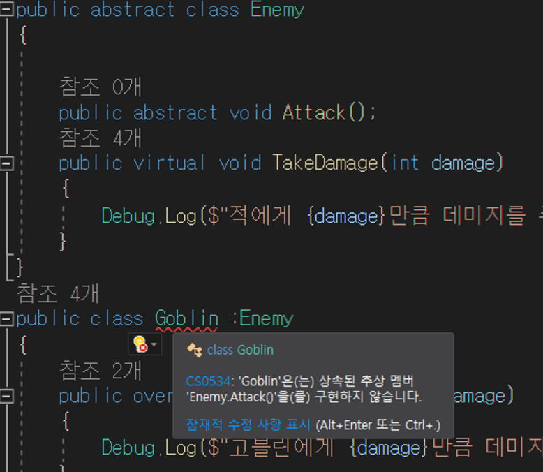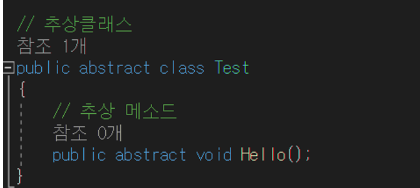 - 추상 메소드를 정의할 때 static, virtual을 사용할 수 없고, abstract 키워드를 사용해서 정의한다.