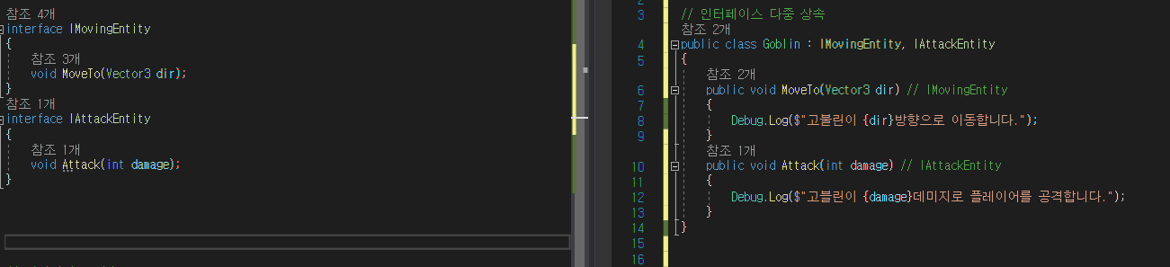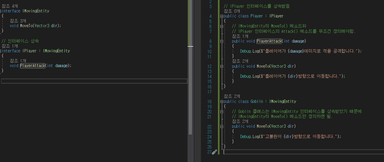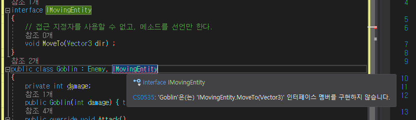 만약 PlayerAttack() 메소드를 IMovingEntity 인터페이스에 정의했다면 PlayerAttack() 메소드가 필요없는 Goblin 클래스에서도 정의를 해야된다.