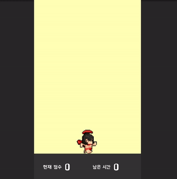 빗물 피하기 게임은 플레이어가 한쪽 방향으로 움직이는 르탄이를 마우스 클릭을 이용해 방향을 바꾸면서 파란색 계열의 공을 먹고 빨간색 공을 피하는 게임이다.