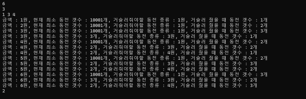 이 중 가장 적은 3원을 거슬러 줄 때 최솟값인 2개가 6원의 최소 거스름돈 갯수이다. (6 == 3 + 3)