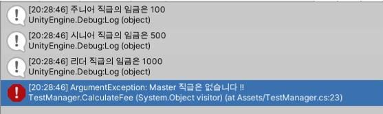 Debug.Log($"마스터 직급의 임금은 {CalculateFee(new Master())}");