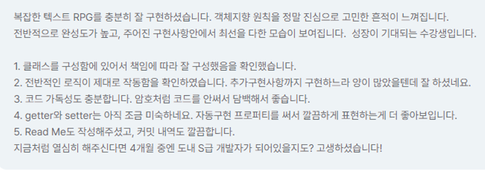 위 피드백에 나와있는 "S급 개발자" 를 목표로 더 열심히 노력해야겠다.