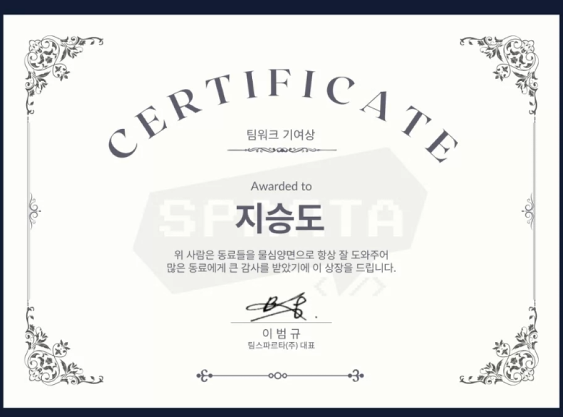4개월 동안의 캠프 생활을 종합해서 뽑는 팀워크 부문에서 170여명 중 1등을 했다.