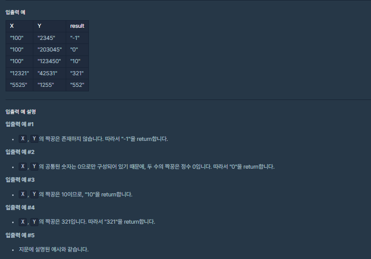 이 문제는 문자열 X와 문자열 Y에서 같은 숫자들을 찾은 뒤, 같은 숫자들을 조합해 가장 큰 수를 반환하는 문제이다.